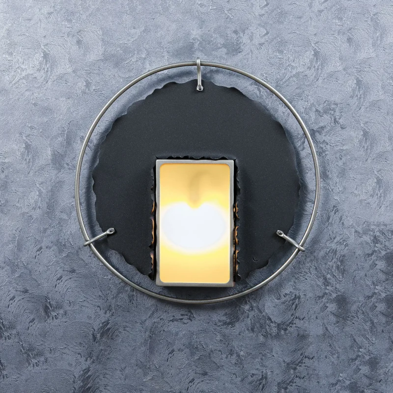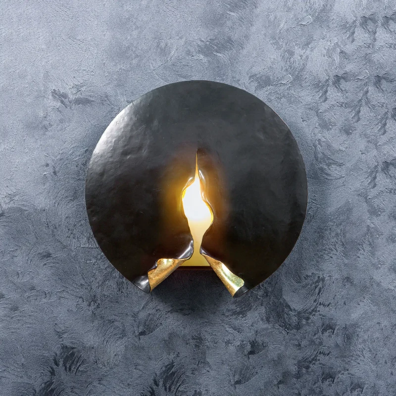 Designed for modern interiors, the Lyton lamp showcases a torn metal detail with edges turned outward, revealing golden leaf plating beneath. The handcrafted convex shape and handmade impact marks give this sconce a unique and striking look. When lit, the light reflects off the golden surfaces, creating the effect of a burning candle.Ridgy Wall Sconce