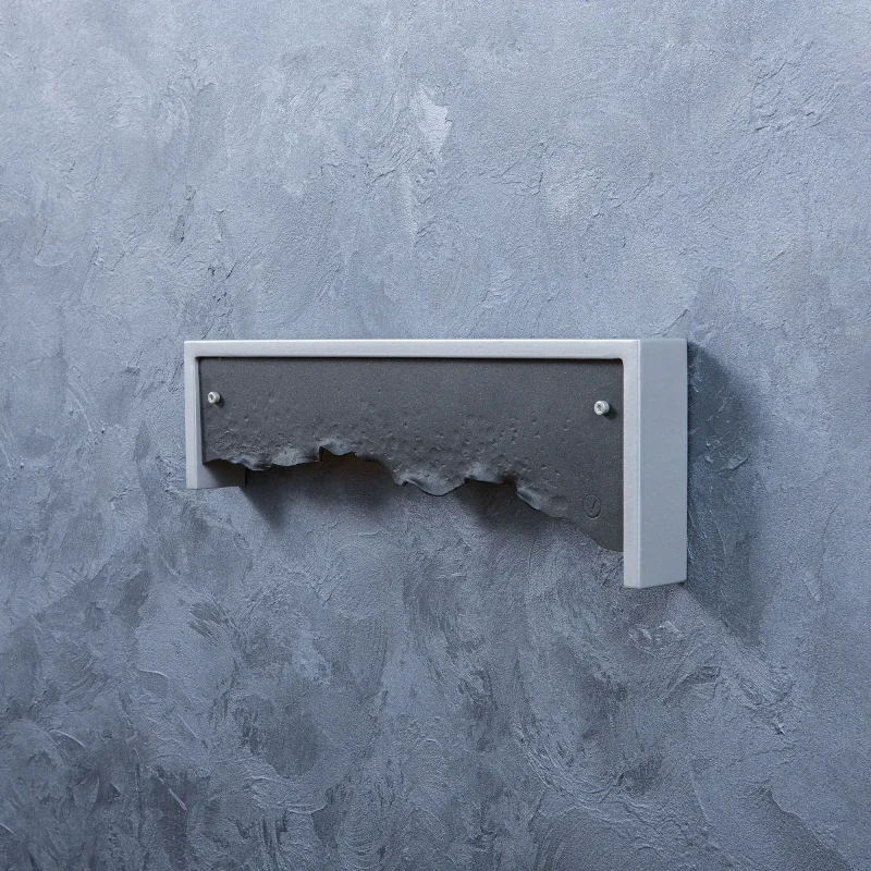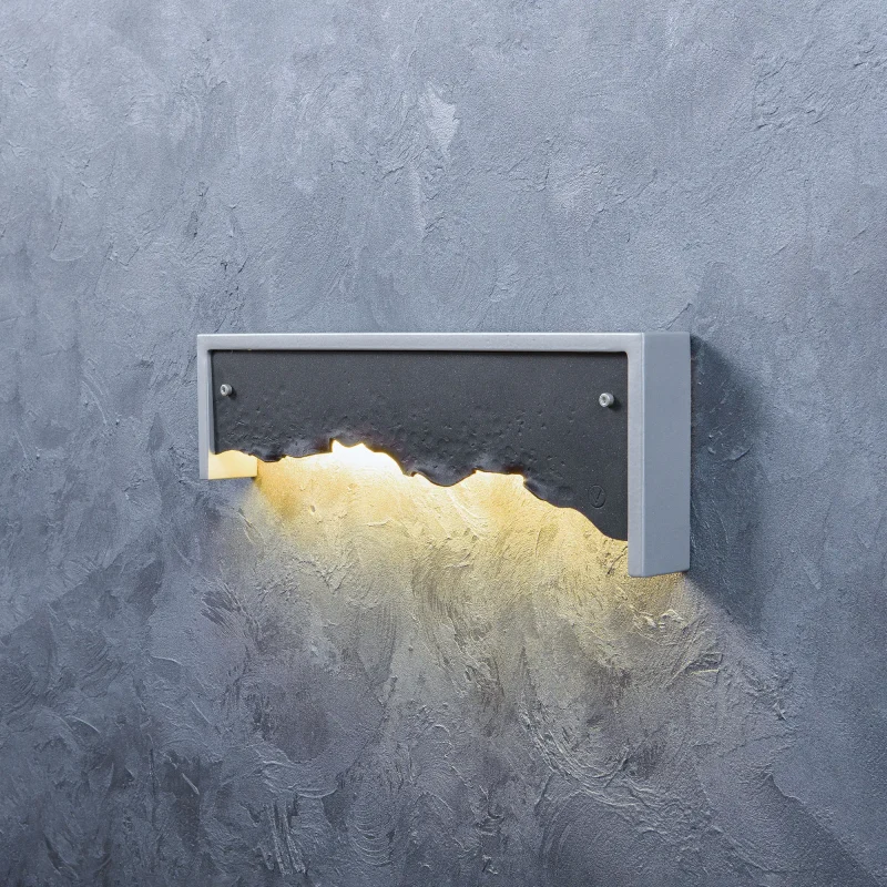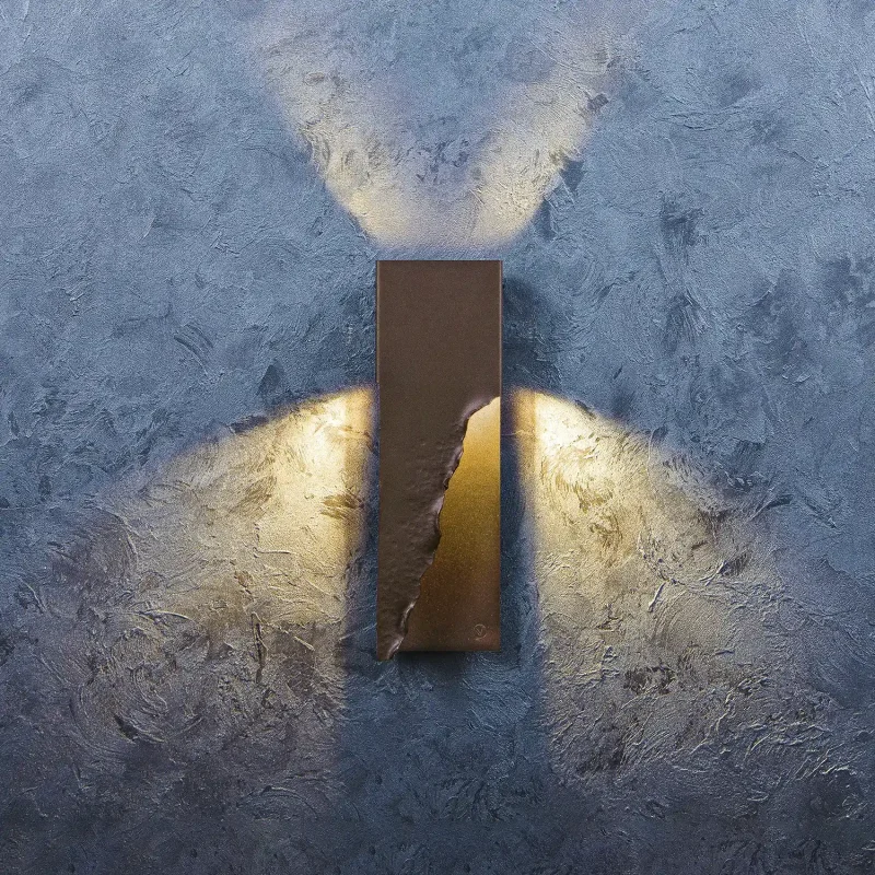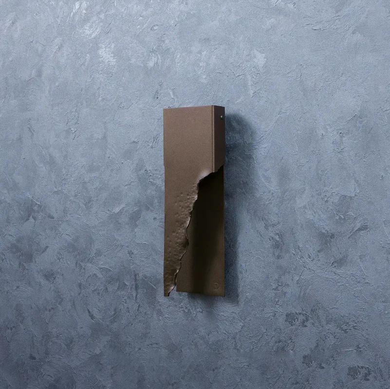 Simple yet bold, the Ridgy lamp’s rectangular shape and torn edge offer a blacksmith’s raw aesthetic. The smooth, illuminated back panel highlights the textured edge, while the warm light spreads across the walls, creating a beautiful pattern. Available in matte black or fosforus (dark brown with a red tint), this sconce adds rustic charm to any space.Rollin Wall Lamp