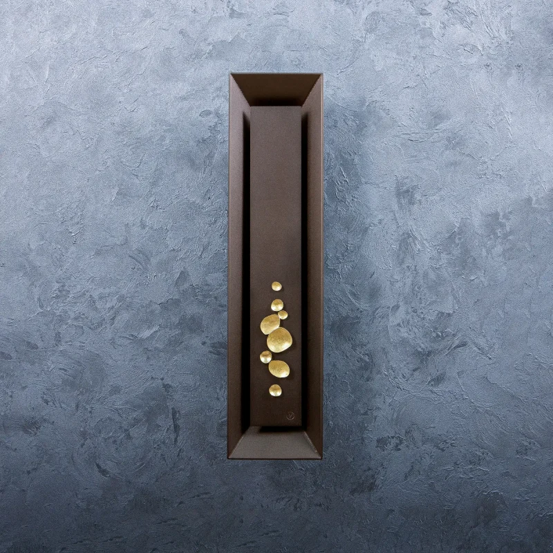 A minimalist yet striking design, Skalatto features a floating front panel with decorative gold petals that seem to sparkle in the light. The hidden LED strip casts soft light onto the beveled sides, creating a halo effect around the dark front panel.Zaluchi Wall Sconce