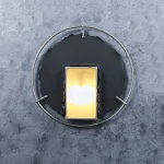 The light box seems to break out through the central panel. It tears the metal and leaves jagged edges on the sides. A wave runs along the outer border of the central decorative panel.