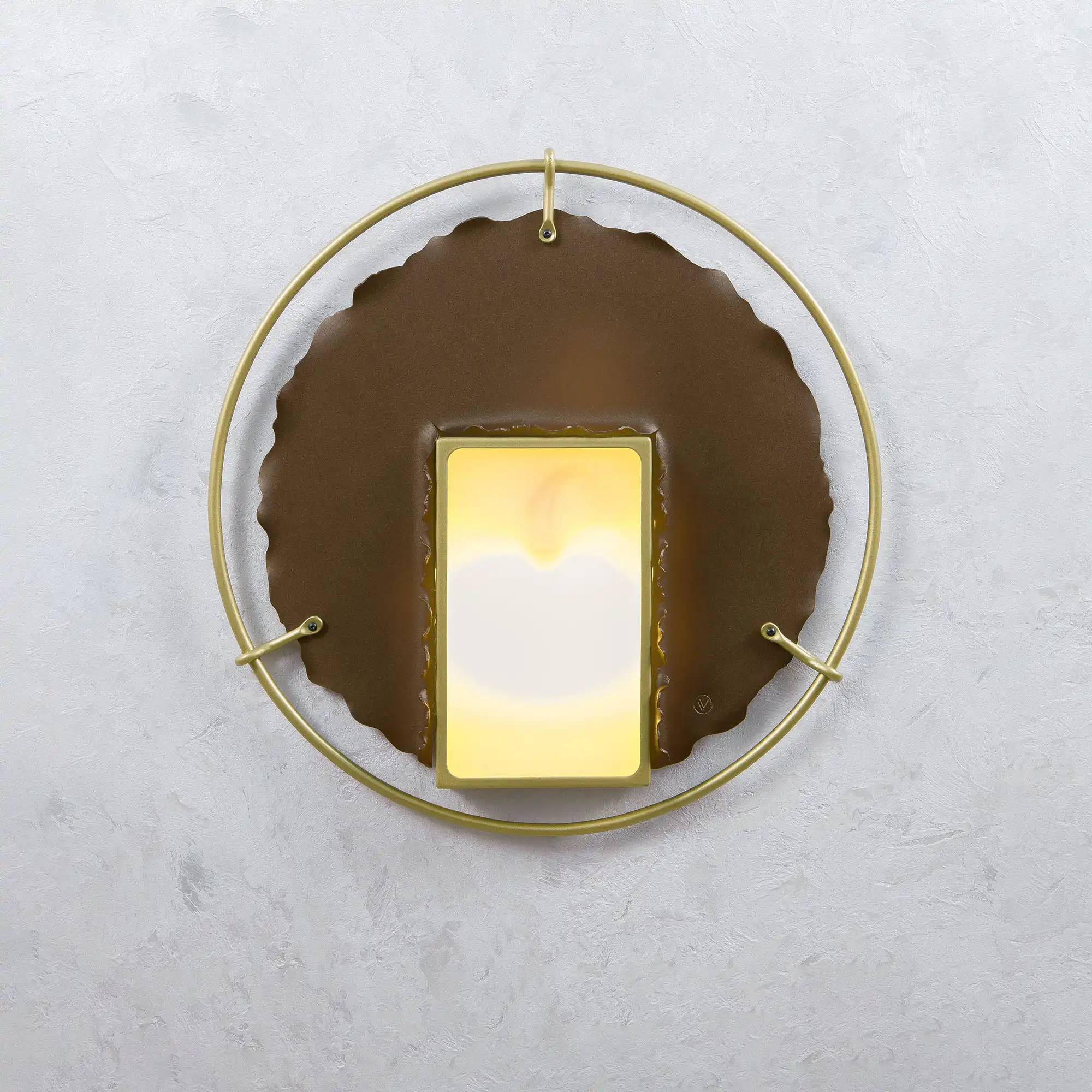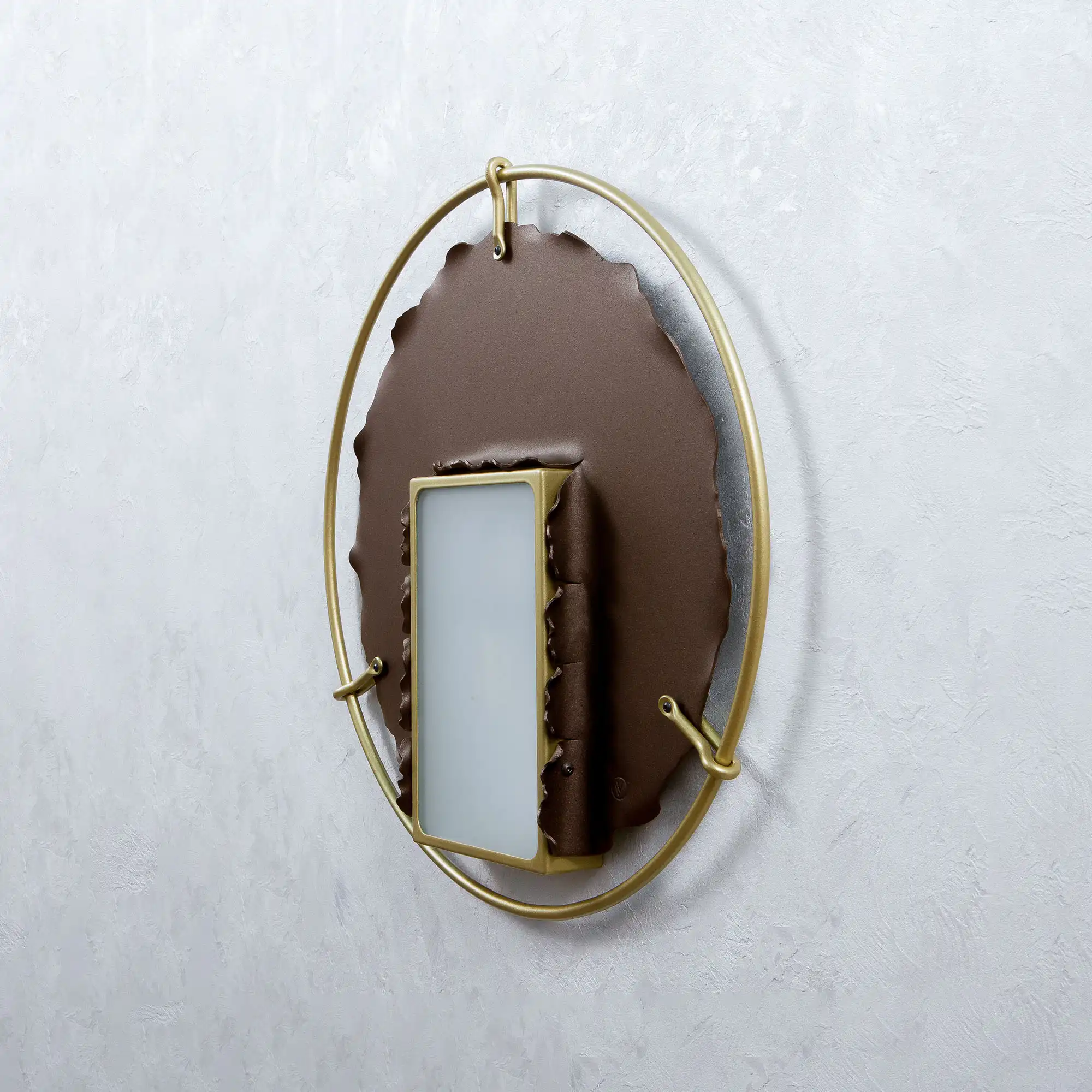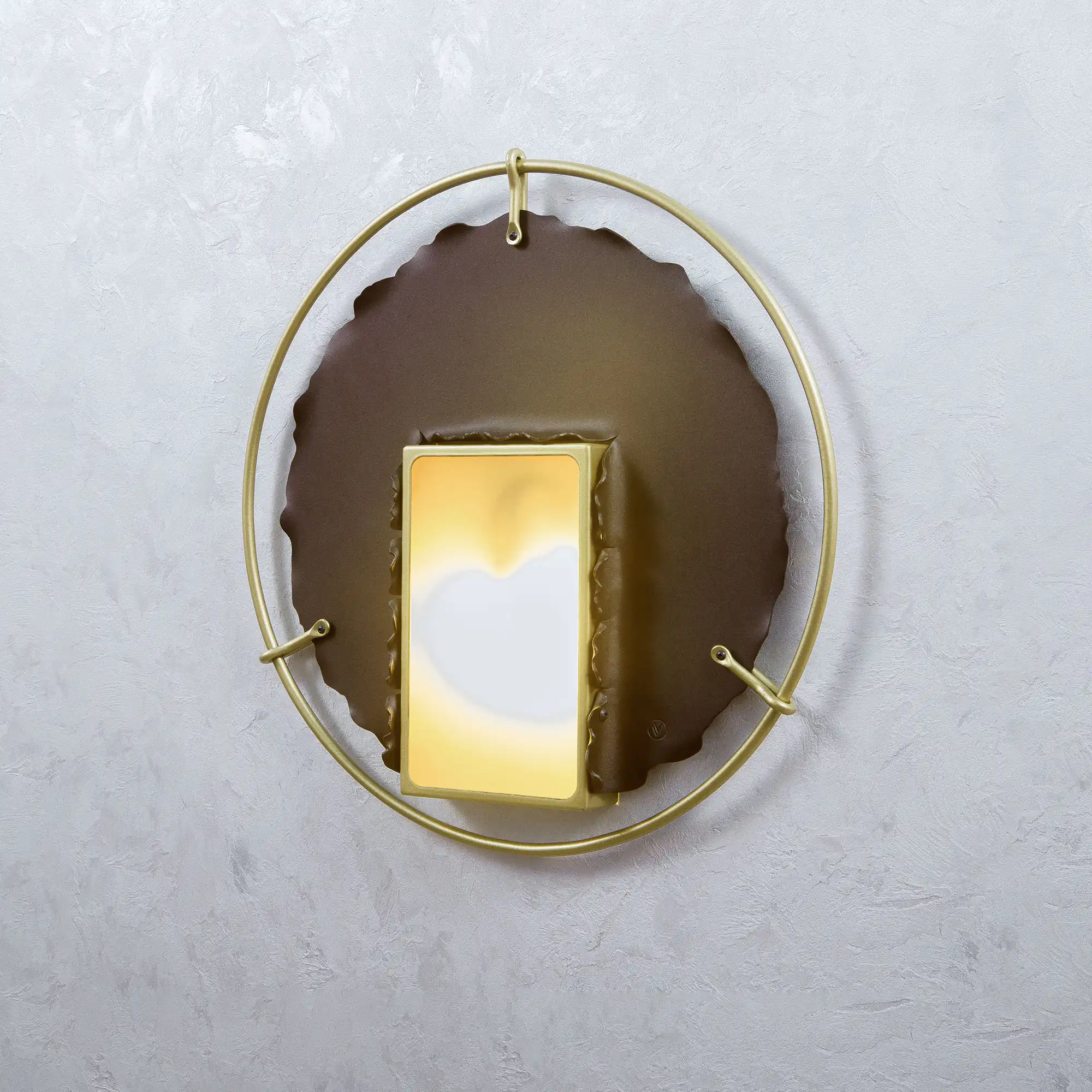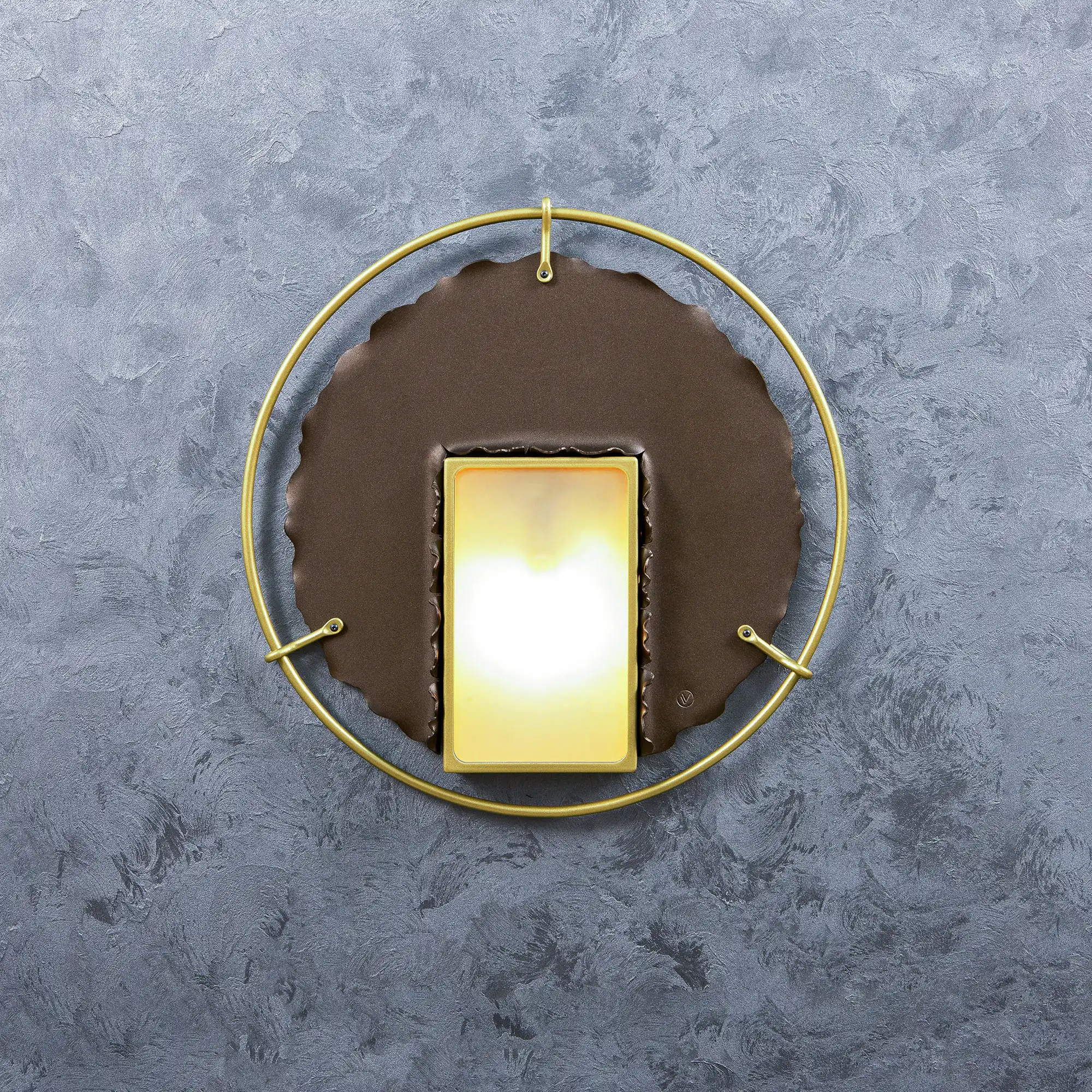 The hoop and the box, where the light source is hidden, are painted in gold, while the decorative panel is painted in silky bronze.