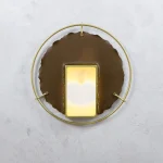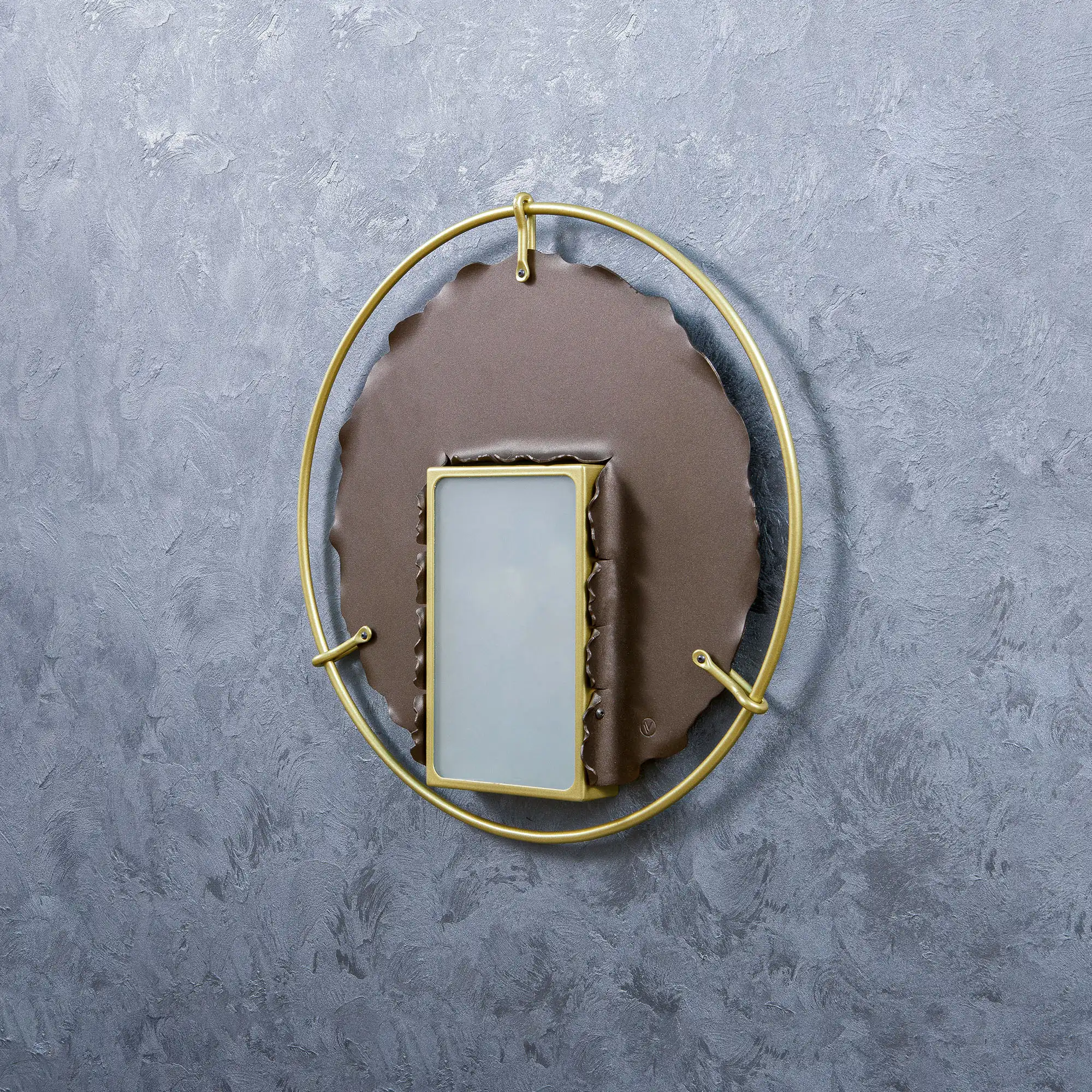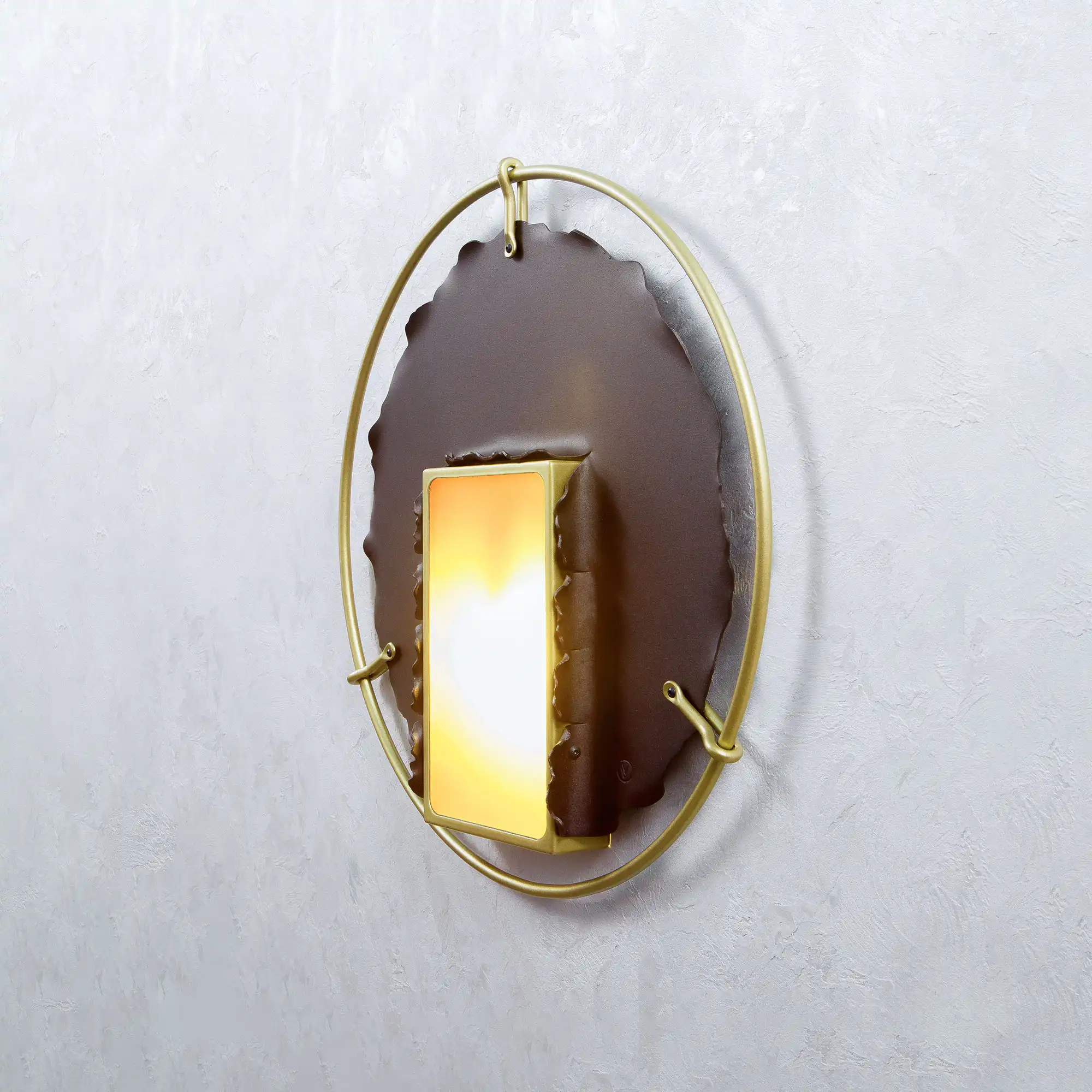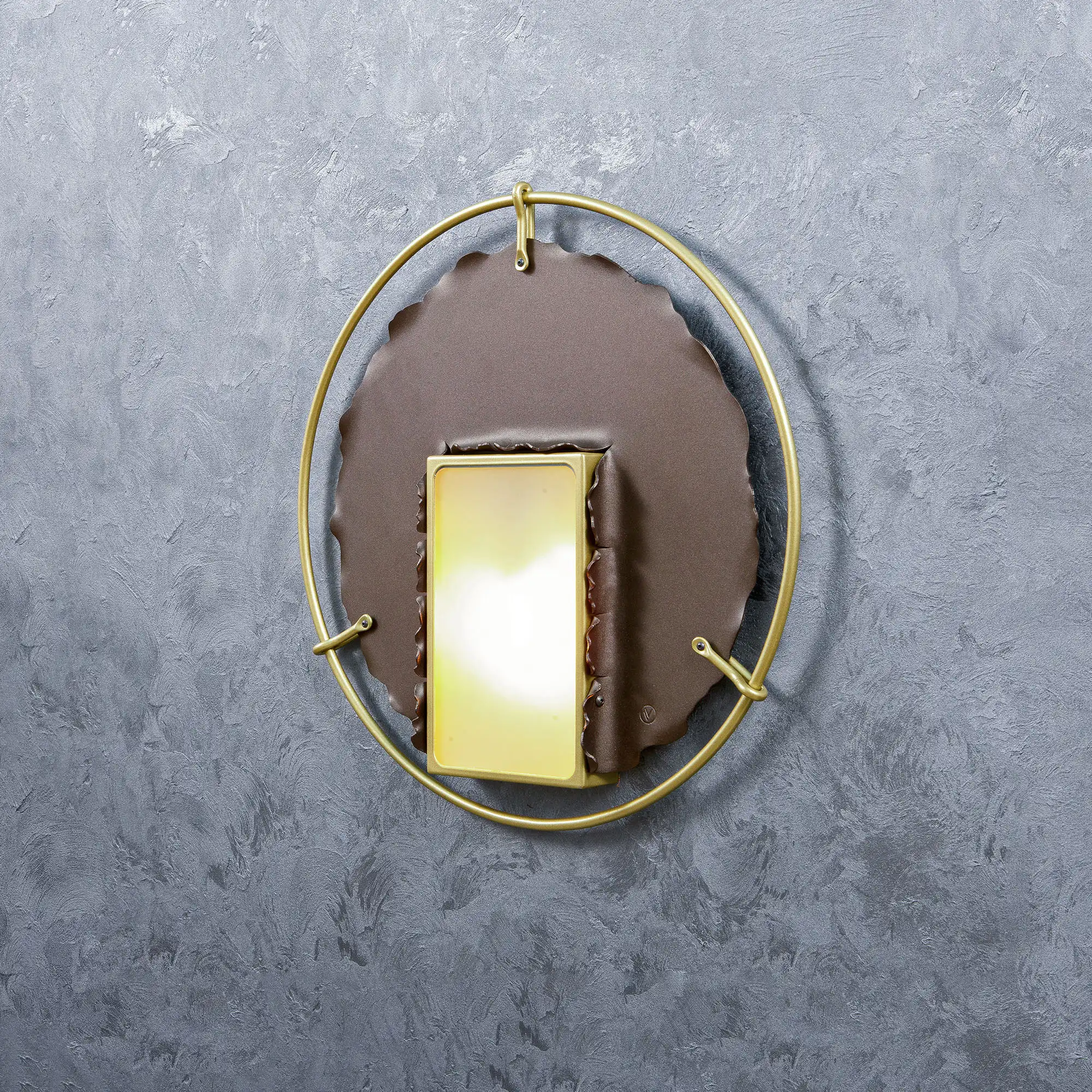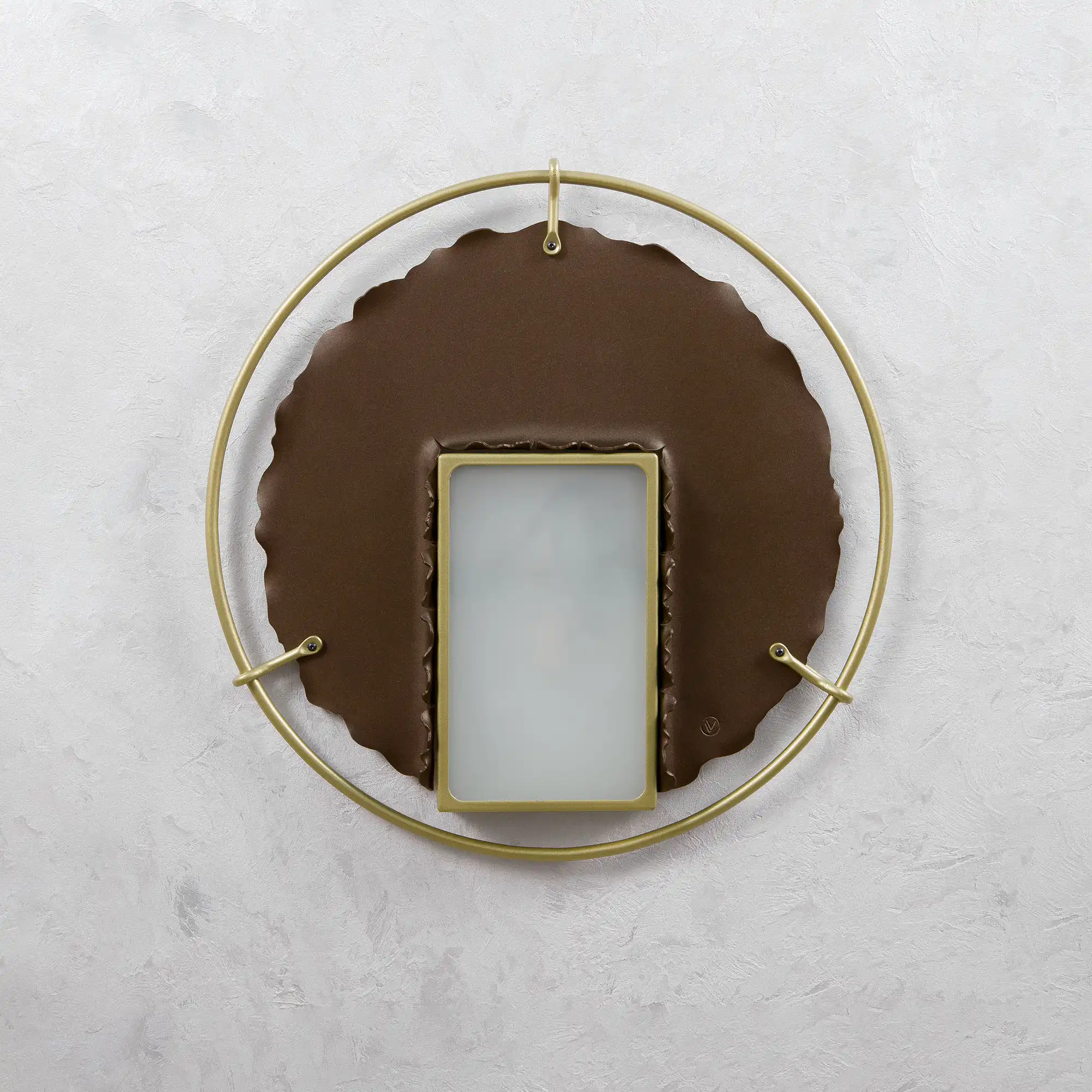 The hoop and the box, where the light source is hidden, are painted in gold, while the decorative panel is painted in silky bronze.