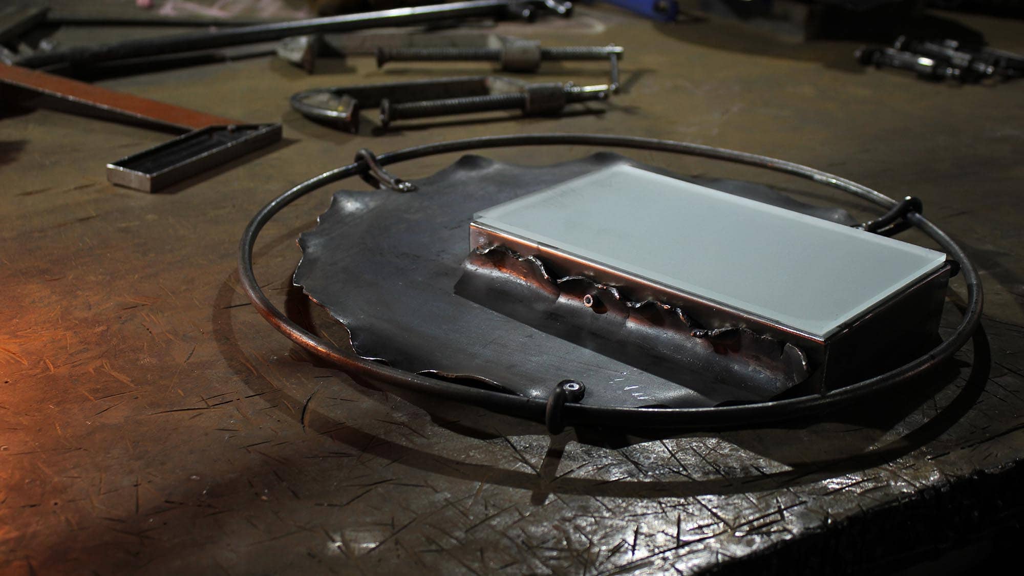 The light box seems to break out through the central panel. It tears the metal and leaves jagged edges on the sides. A wave runs along the outer border of the central decorative panel.