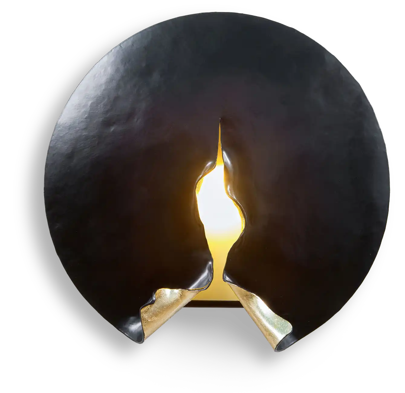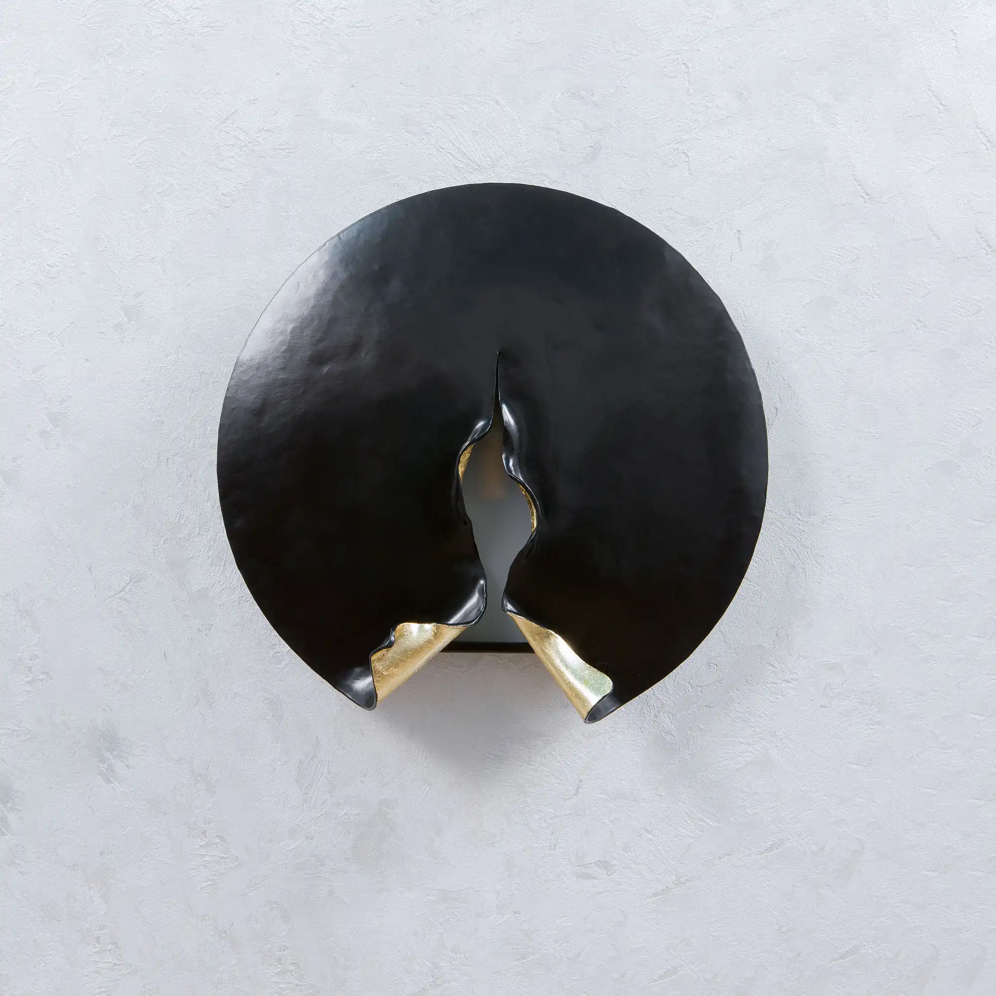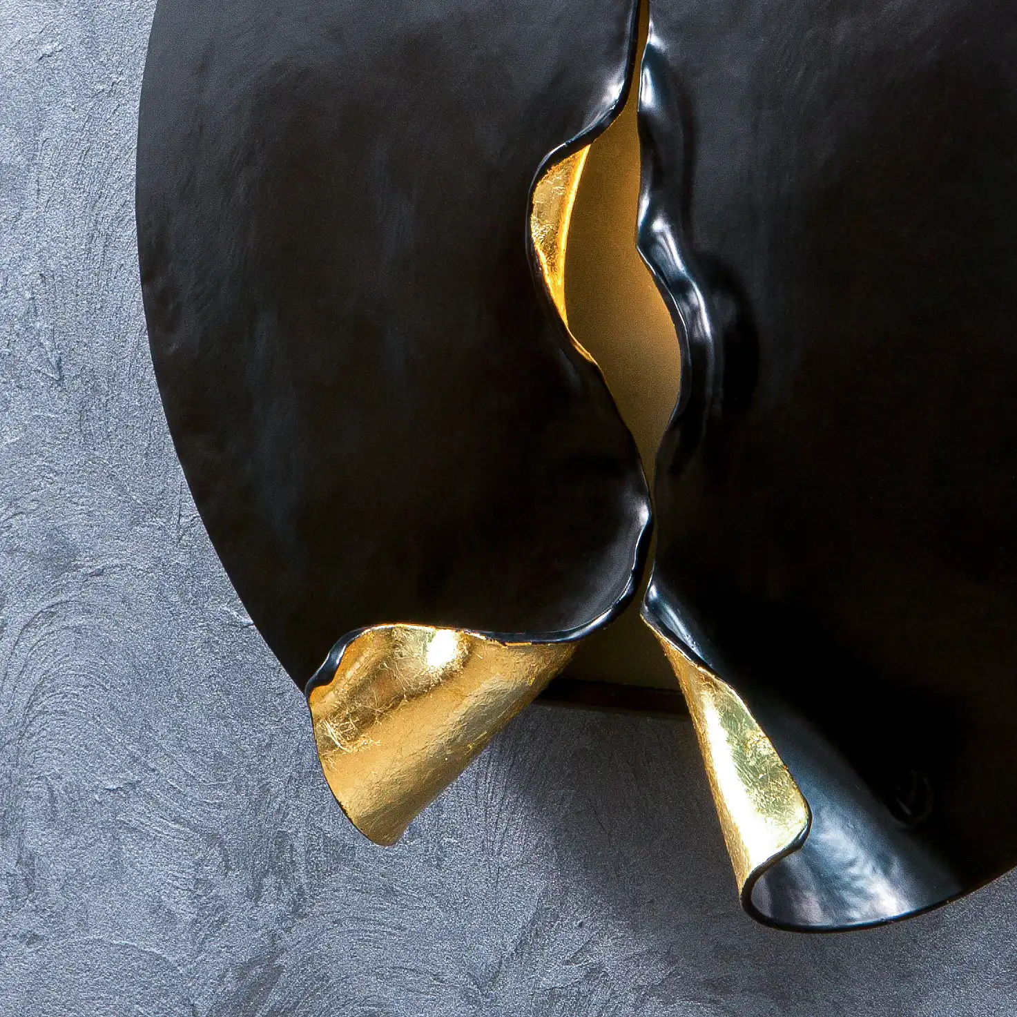 For maximum visual effect, the front side of the fixture has a black matte and smooth surface, while the folded parts of the back are plated with golden leaf and coated with a protective varnish.