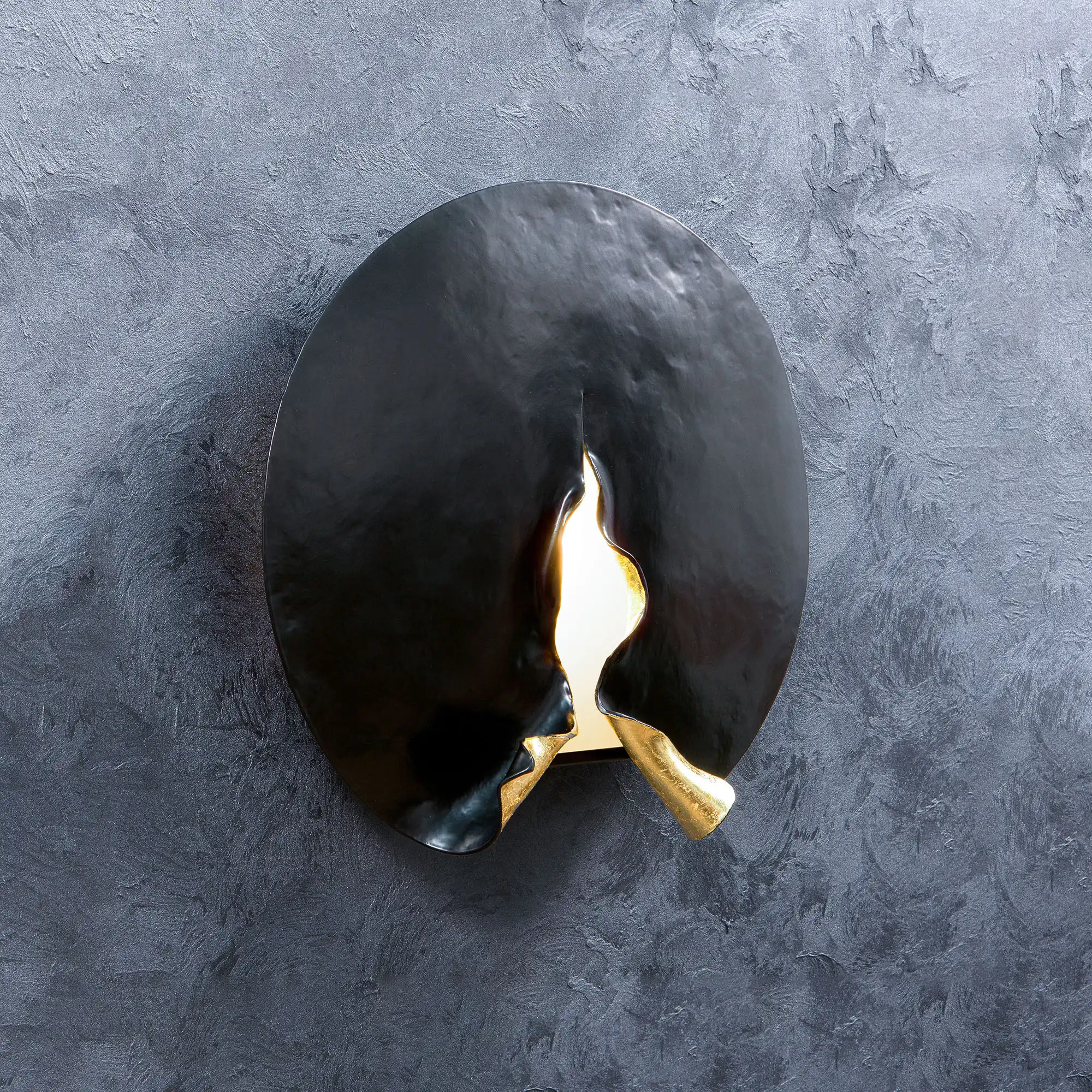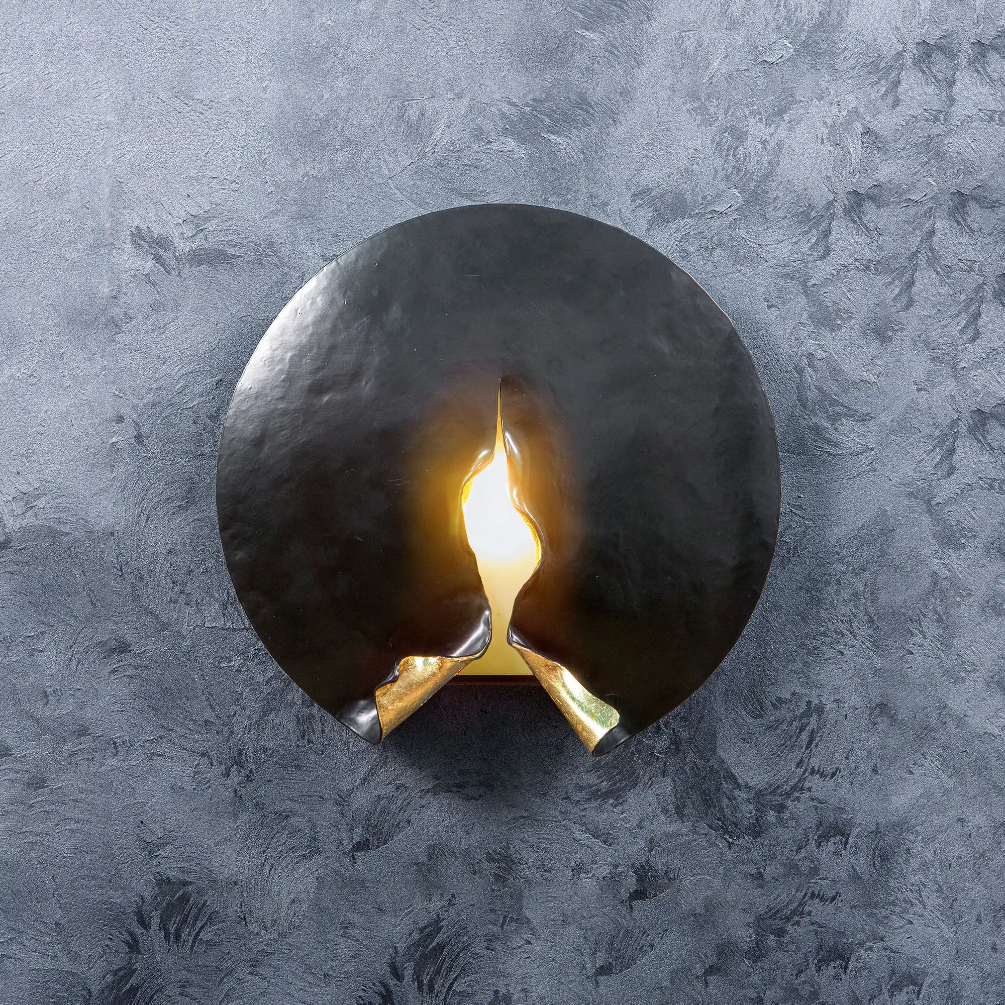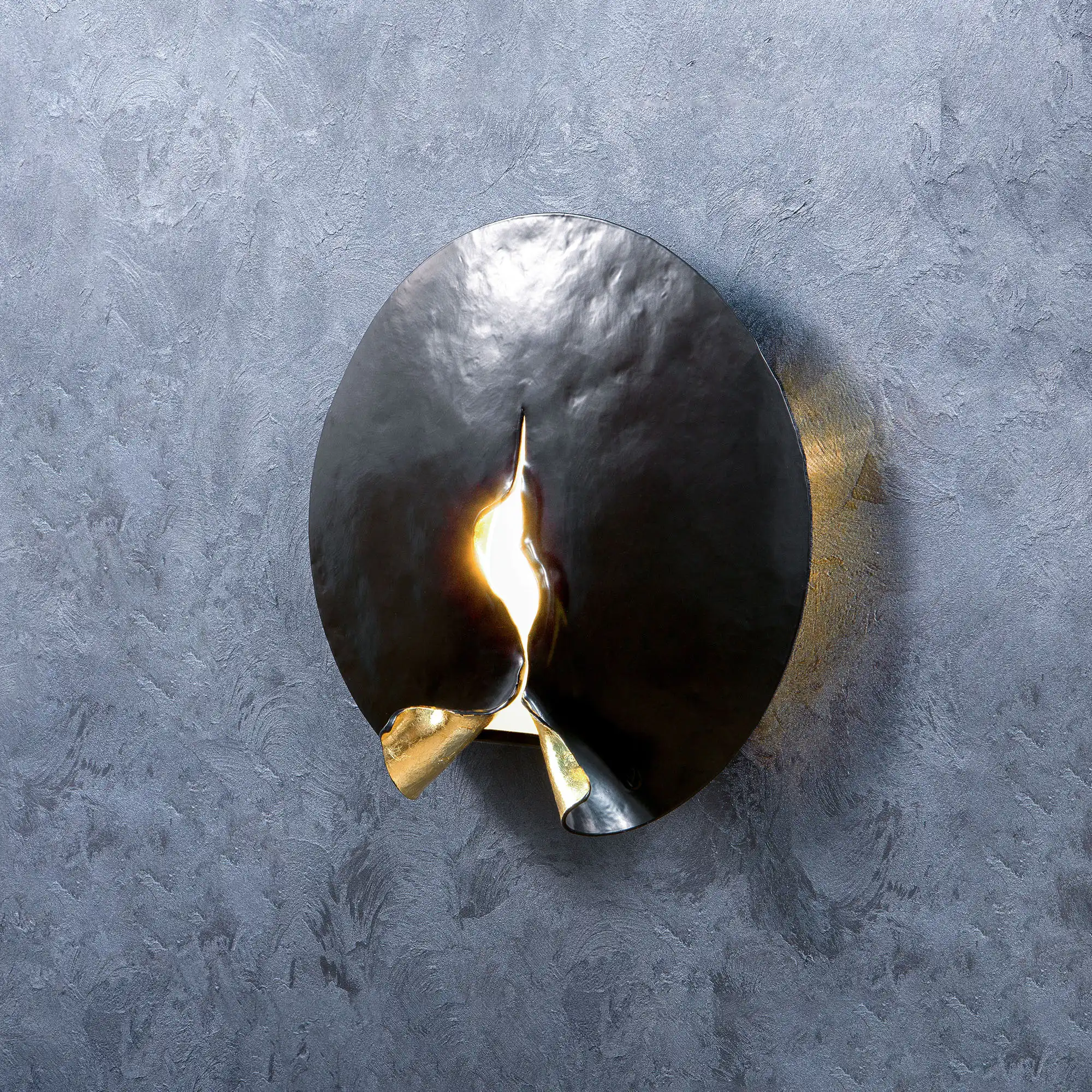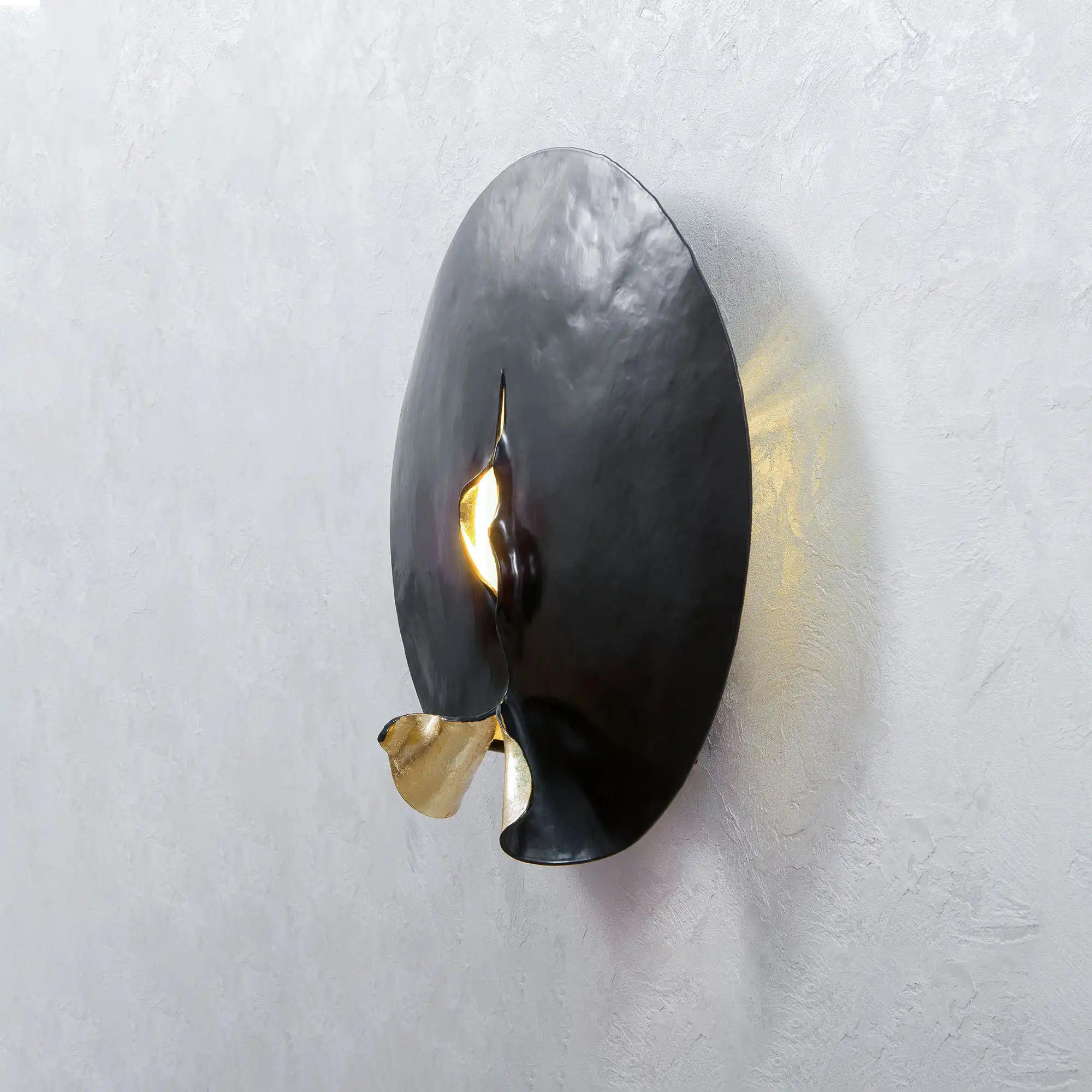 For maximum visual effect, the front side of the fixture has a black matte and smooth surface, while the folded parts of the back are plated with golden leaf and coated with a protective varnish.