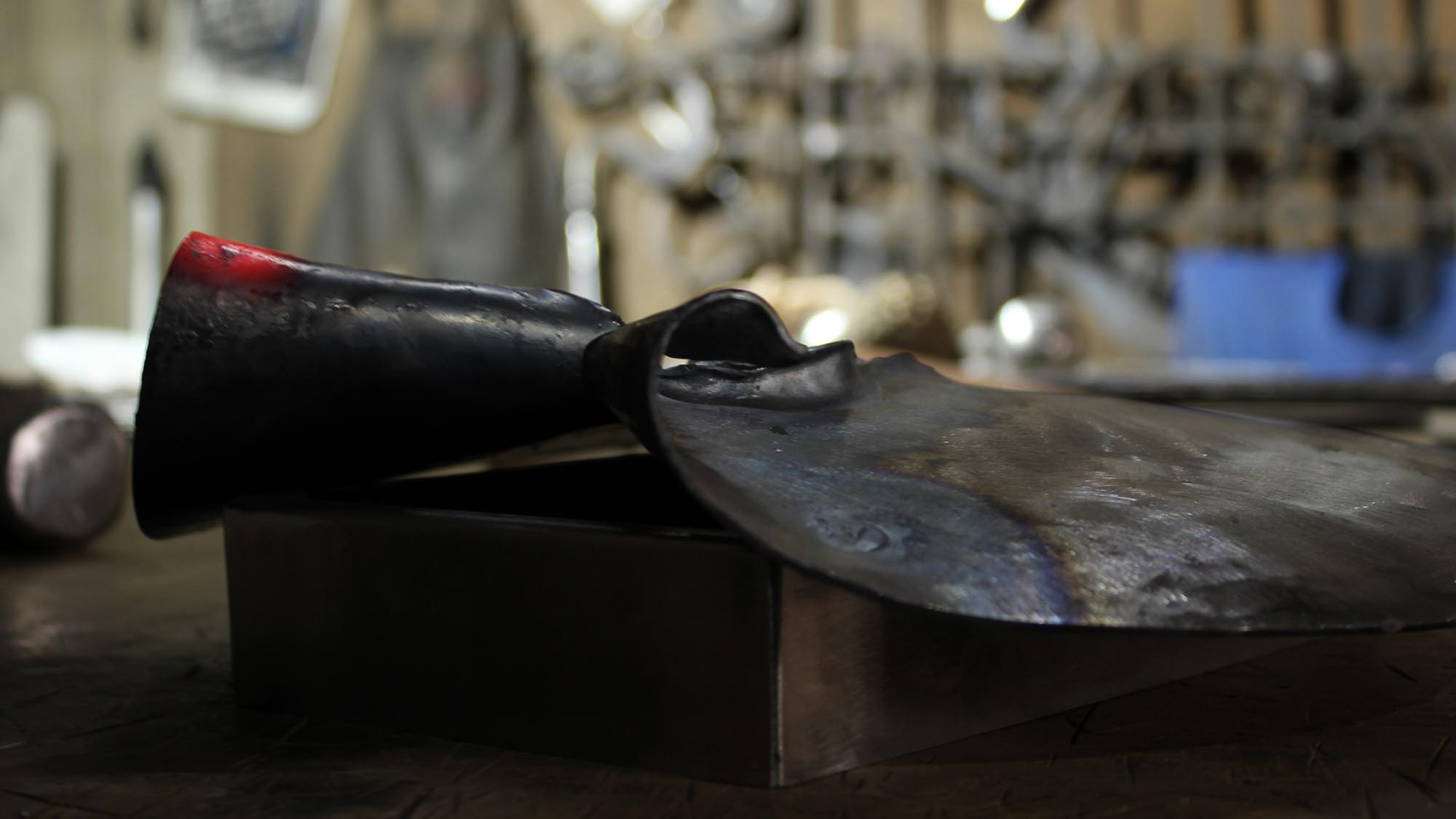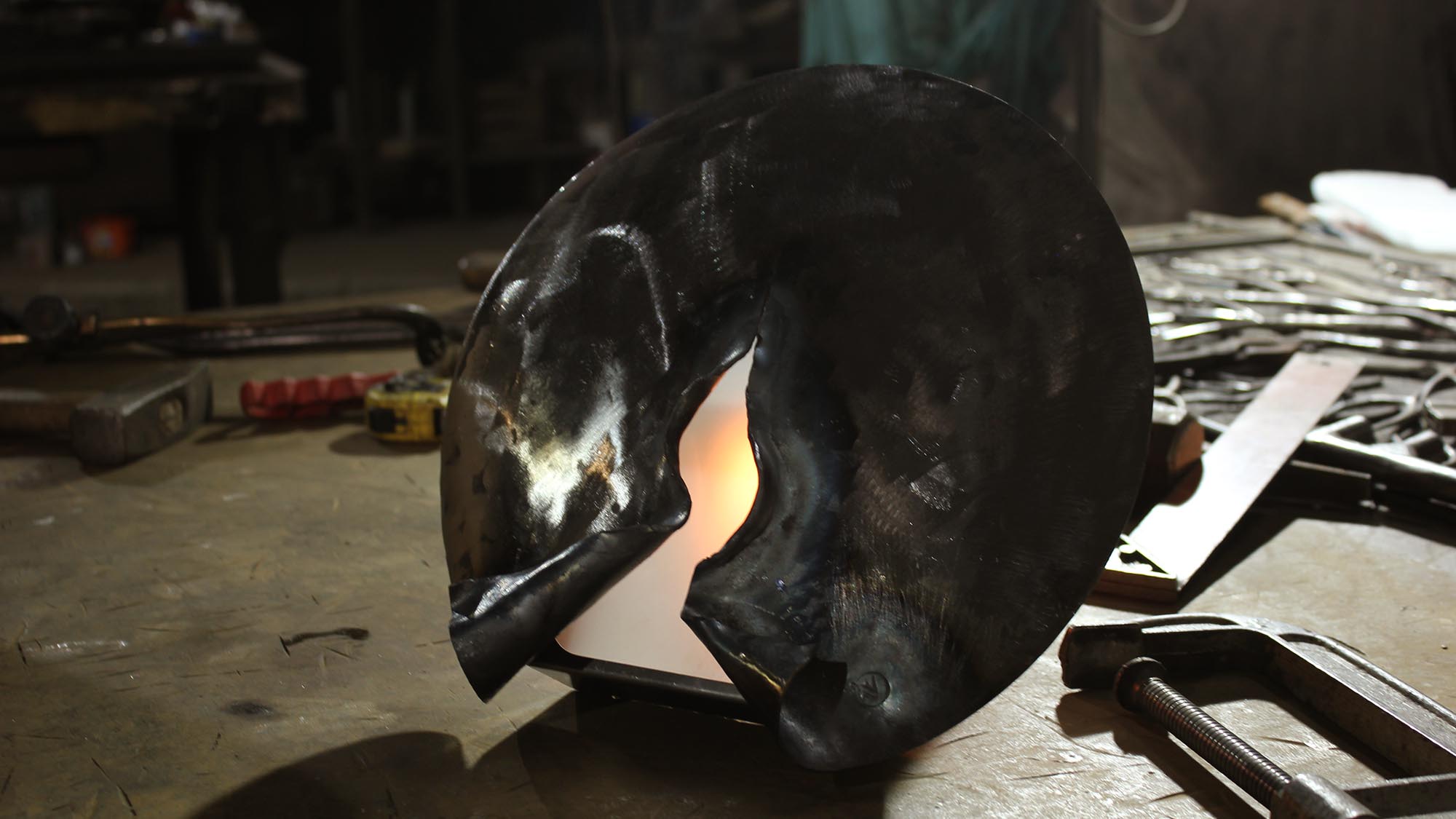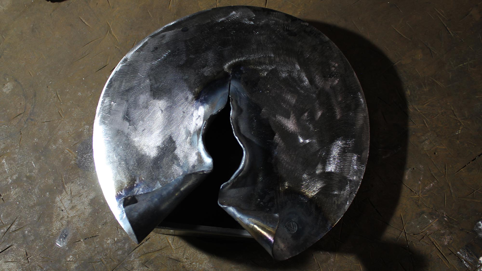 The split in the metal front panel is made by the hand of a blacksmith