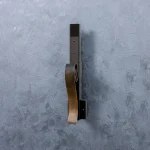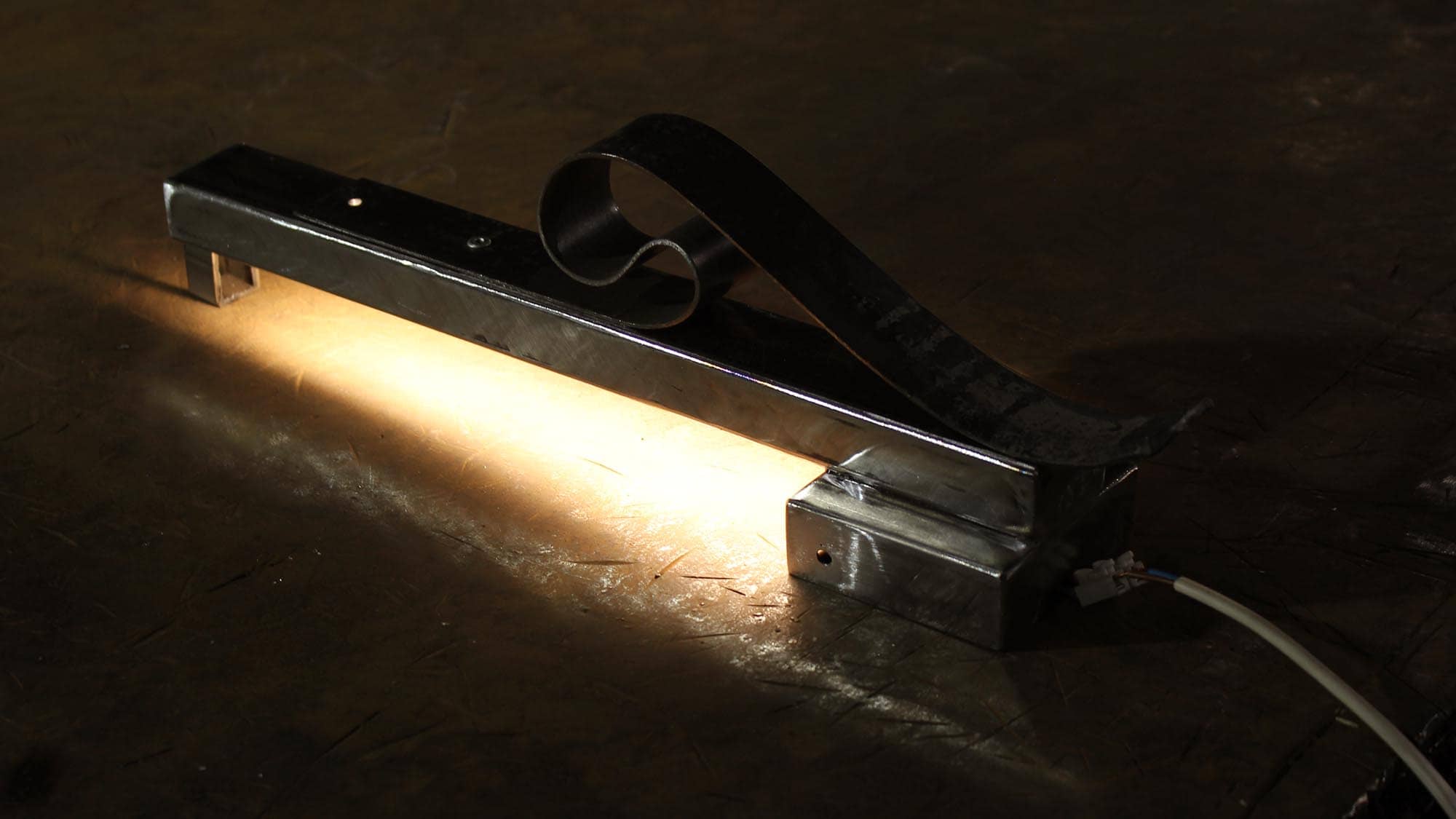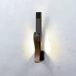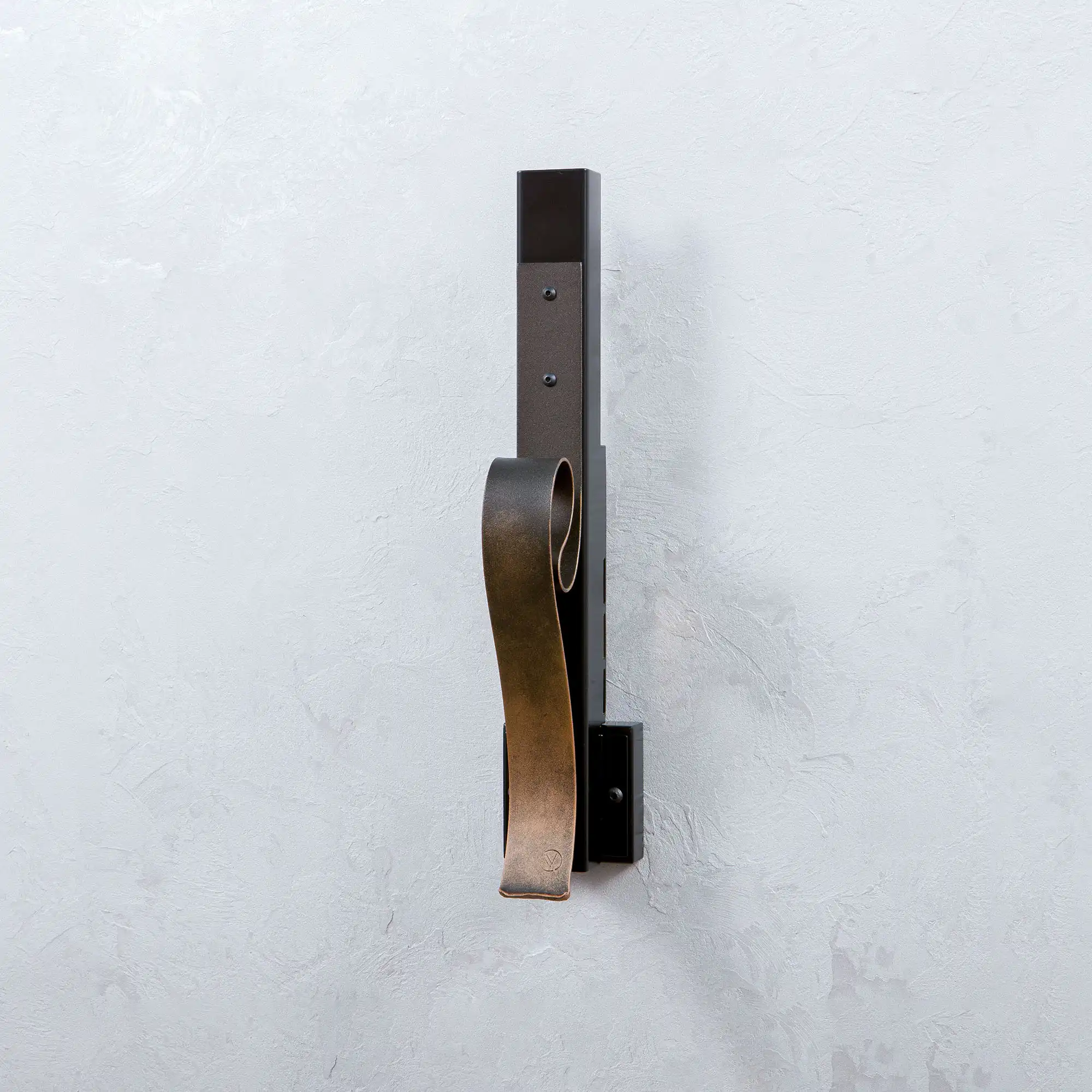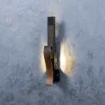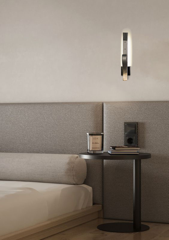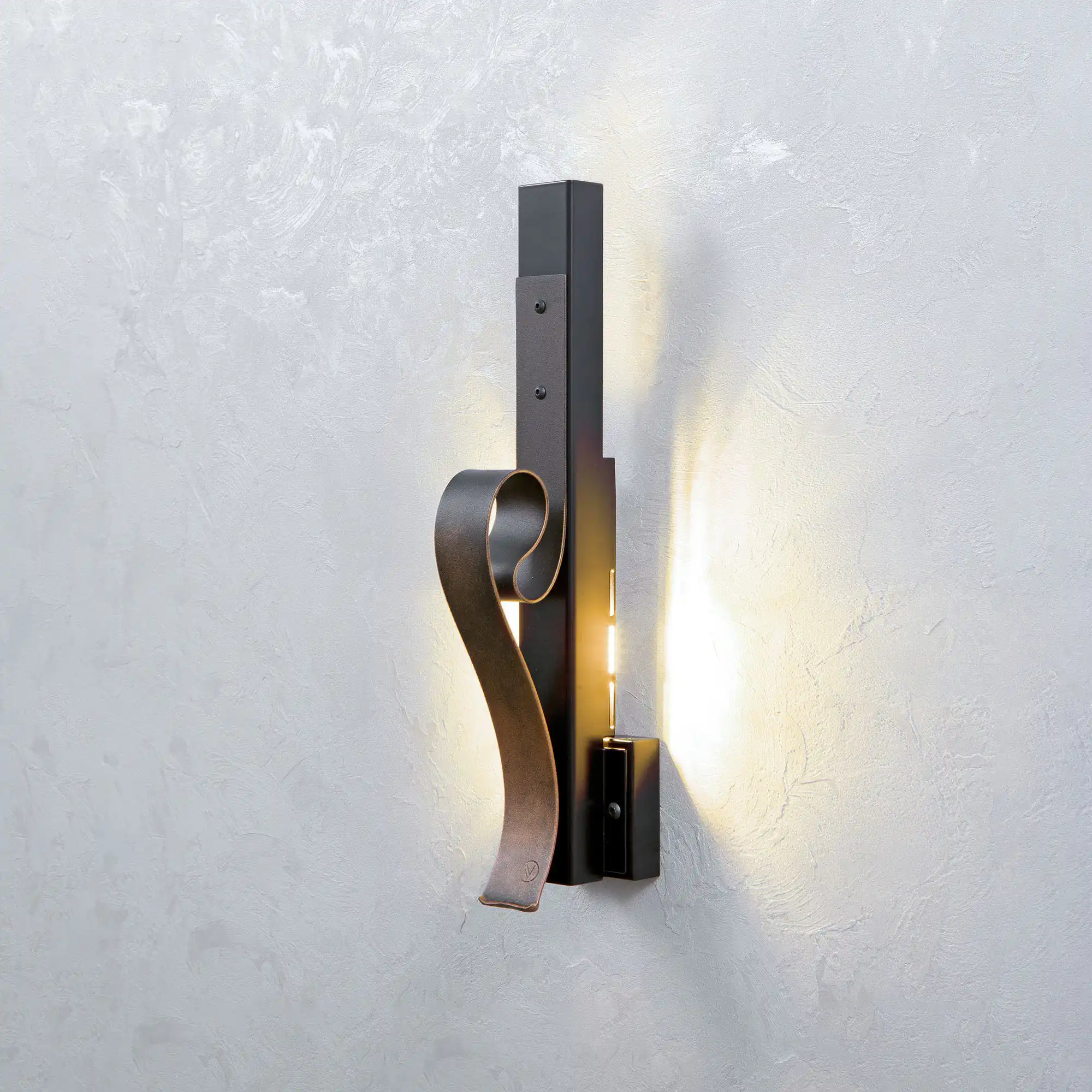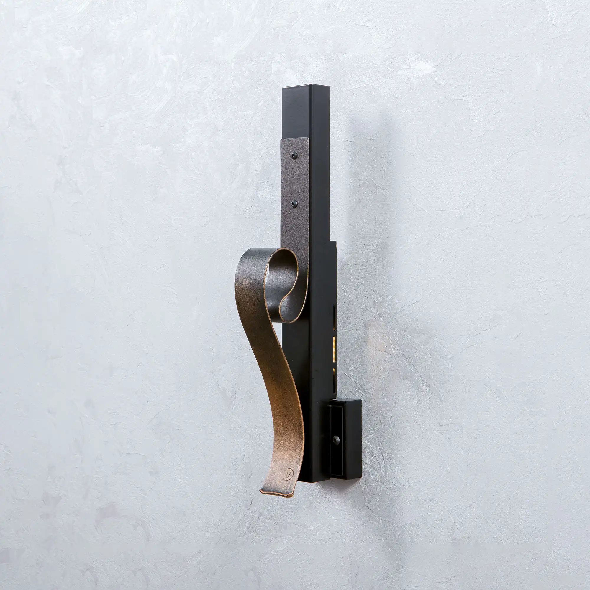 The concept of this wall fixture is built around a simple vertical base and a decorative bent and hand-crafted strip that resembles a whip. We tried to enhance the difference between the body and the decorative part at the tactile level. Both parts are painted matte black, with the body a smooth paint and the whip a velvet effect paint. A bronze patina is applied to the tip of the whip with a fading effect.
