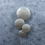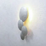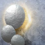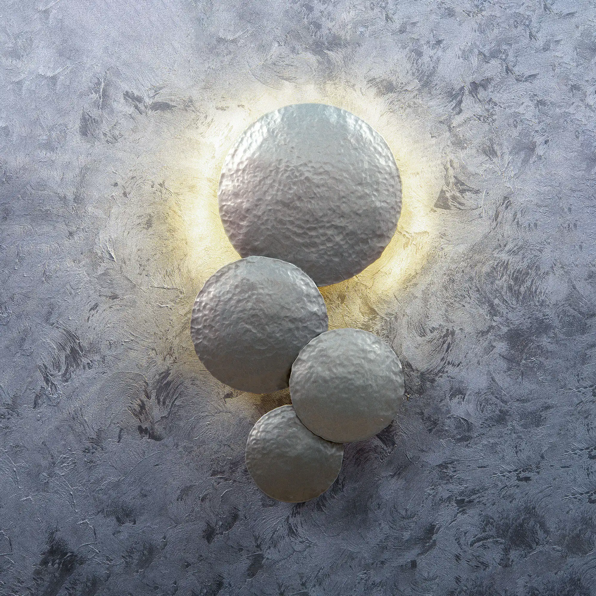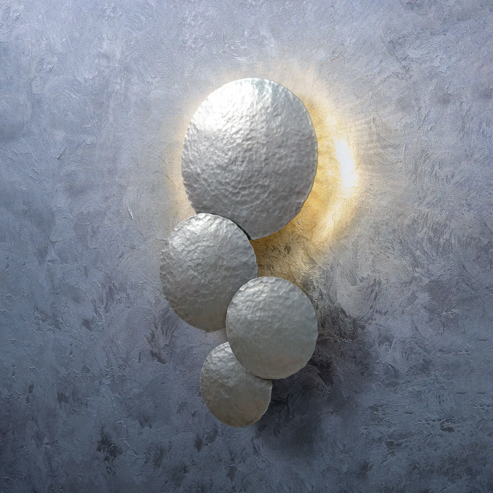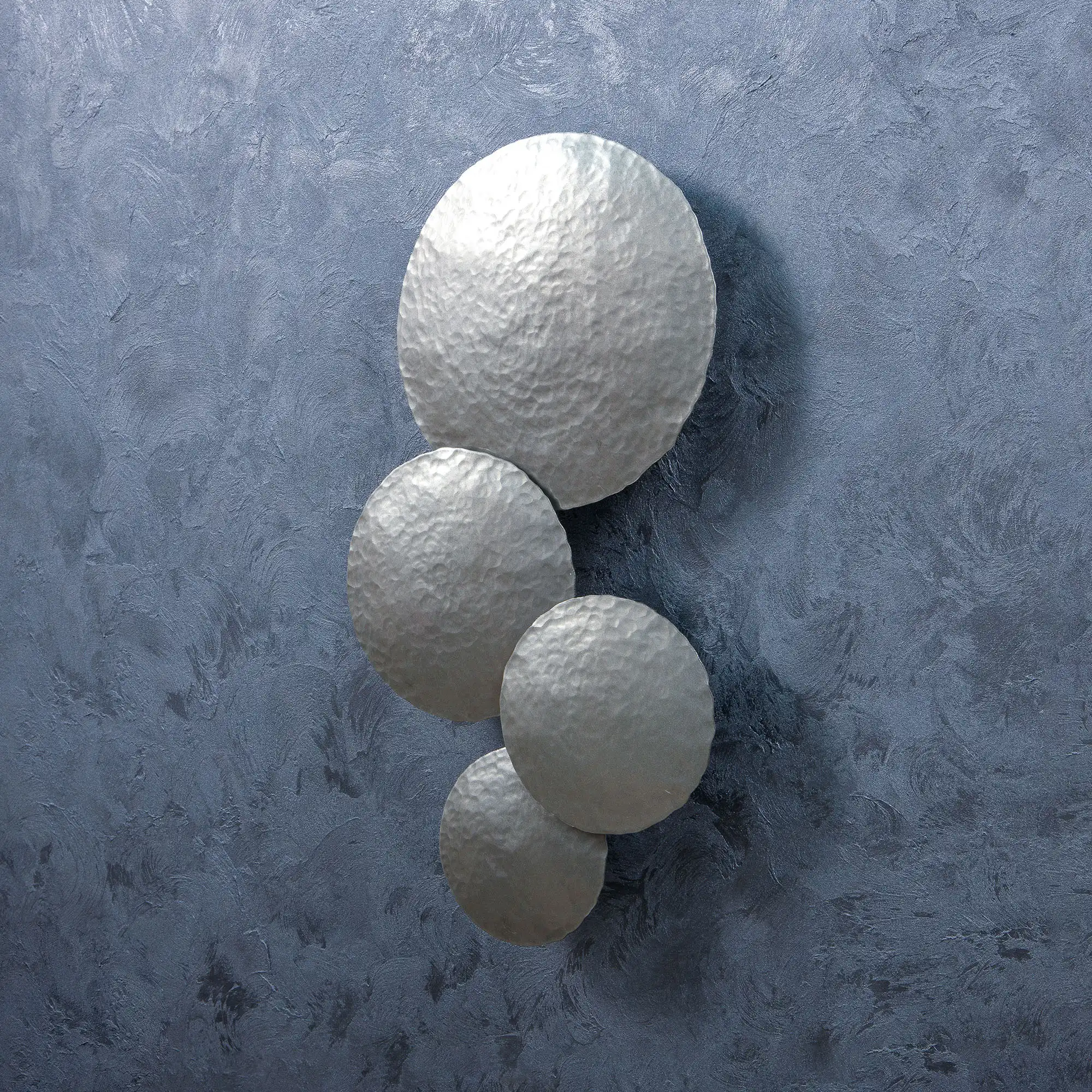 The Zaluchi Wall Sconce is a stunning blend of artistry and functionality. Crafted from metal, its design features a vertical cascade of four convex disks, arranged from larger to smaller, creating a striking visual effect. Each disk is meticulously textured by hand, adding depth and character to the fixture. Glossy silver paint emphasizes and reveals the rough texture.